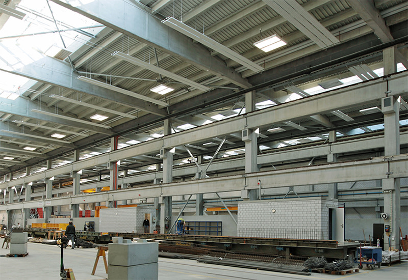 Le nouveau bâtiment se compose de quatre nefs parallèles d’une surface utile de 12 054 m2. La géologie et les exigences du sol de l’atelier, avec des tassements aussi faibles que possible et des charges ponctuelles élevées, ont requis 1292 pieux en béton de différentes sections pour soutenir les piliers porteurs et les dalles en béton. Le sous-sol est réalisé en béton coulé sur place, les sols des ateliers sans joints avec un béton fibré acier «MONO».