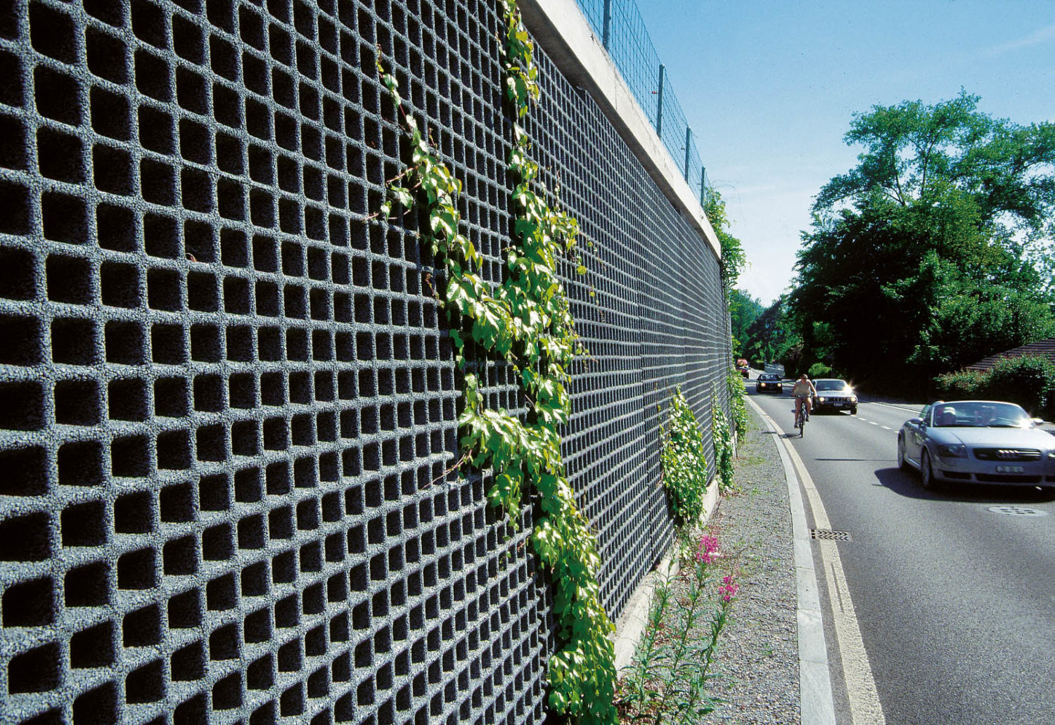 La structure du béton de lave se prête parfaitement à la végétalisation des surfaces absorbant le bruit des parois anti-bruit. Les plantes auto grimpantes trouvent le support nécessaire dans la structure poreuse du béton. Peu de temps après la plantation, les pousses prennent de l'ampleur et font progressivement disparaître les parois anti-bruit sous leur feuillage.