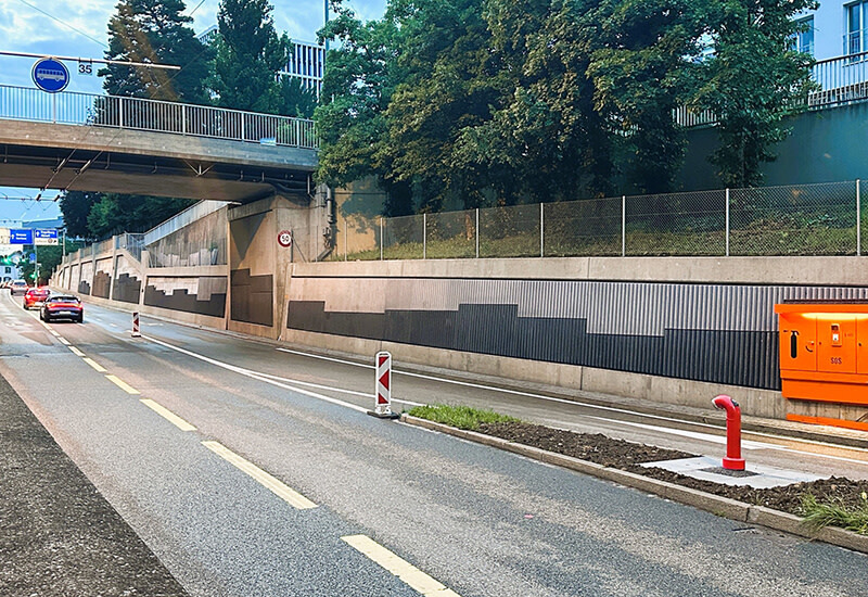 Die Lärmschutzwände, jedes Stück ein Unikat, zeichnen sich durch einen hohen Absorptionswert aus, der entscheidend für die Wahl des Produktes war. Zusätzlich überzeugt der verwendete Beton durch seine Recyclebarkeit, was einen weiteren wichtigen Vorteil darstellt.