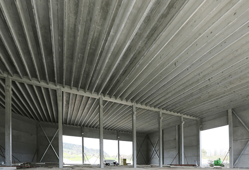 Das ungehinderte Rangieren mit schweren Baumaschinen setzte voraus, dass die Hallengrundfläche mit einem Minimum an Stützen geplant werden musste. Um dies zu ermöglichen, wurde bei der Halle mit dem Grundmass von 50 x 53,50 m nur eine mittige Stützenreihe eingeplant. Dank Vorspannung der Rippenplatten konnte die Spannweite von bis zu 25 Metern überbrückt werden.